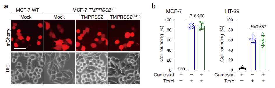 圖2. TMPRSS2 的絲氨酸蛋白酶活性缺失不影響介導TcsH入侵