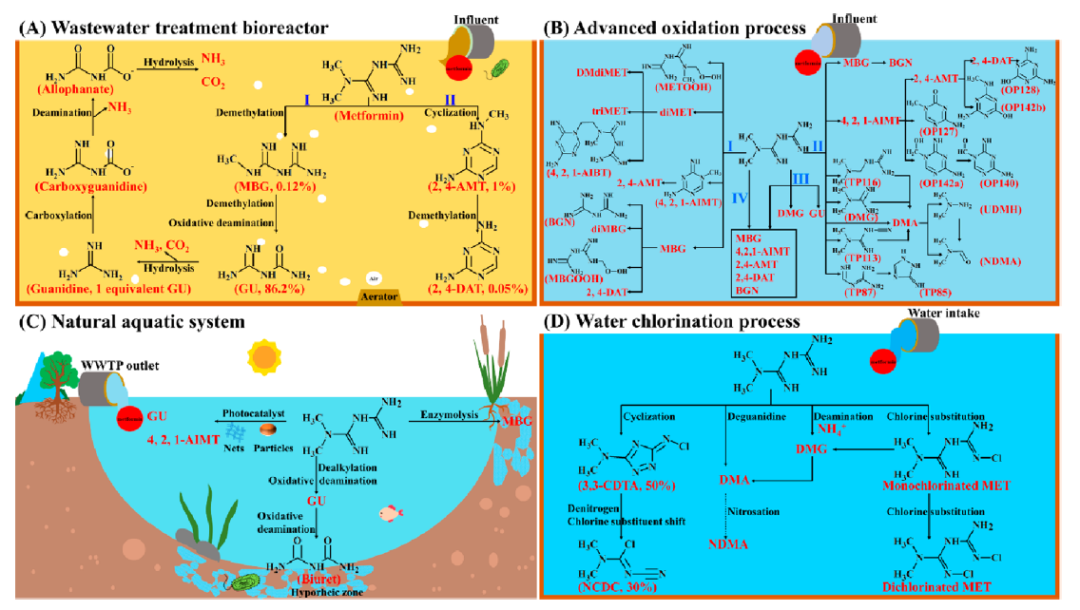 圖2. 二甲雙胍在污水生物反應(yīng)器(A)、高級(jí)氧化過(guò)程(B)、自然水體(C)和氯化消毒過(guò)程(D)中的降解轉(zhuǎn)化和產(chǎn)物形成過(guò)程。