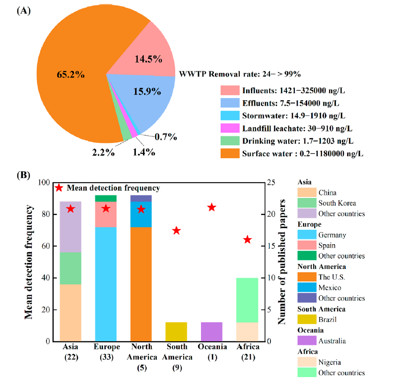 圖1. 全球水系統(tǒng)中二甲雙胍的賦存:(A)各種水系統(tǒng)中檢出二甲雙胍的比例及濃度范圍;(B)各大洲檢出二甲雙胍的文章數(shù)量及在水環(huán)境中的平均檢出頻率,括號(hào)內(nèi)數(shù)字代表在各大洲檢出二甲雙胍的國(guó)家數(shù)量。