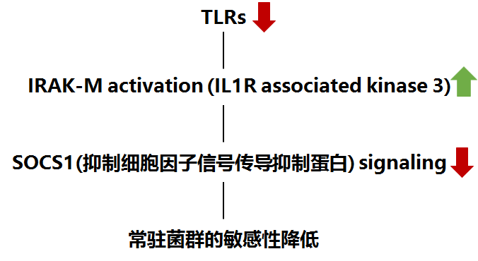 機體與皮膚常住菌群的長期互作,通過病原體相關(guān)分子模式皮膚表面的模式識別受體的特異性識別,減少TLR受體在細胞表面的表達以及激活白介素相關(guān)激活酶3(IRAK-M),通過抑制抑制細胞因子信號傳導(dǎo)抑制蛋白(SOCS1)的表達,達到降低常駐菌群敏感性的目的。