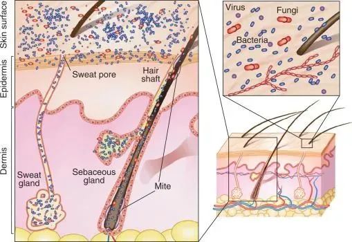 皮膚中存在250種微生物,他們以平均10萬個/平方厘米的密度分布在我們皮膚的表面。這些細菌可以被分為兩個大類:常駐菌群與暫住菌群。常駐菌群是永久定植在皮膚上的,大多人畜無害,擔(dān)任著保護皮膚不受其他病原體威脅的艱巨任務(wù),這類細菌的代表:如表皮葡萄球菌,痤瘡丙酸桿菌等。暫住菌群是由和外部的接觸或者皮膚感染的過程中,暫時降落在皮膚表面的細菌。由于長駐菌群的存在,這些暫住菌群一般不會對人體造成太多的威脅,除非他們直接降落在皮膚損傷的區(qū)域而引發(fā)炎癥和感染。
