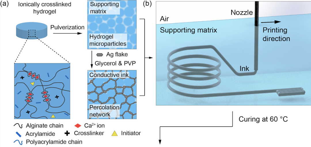 而研究團隊把這兩種水凝膠的固化分成了兩個獨立步驟——先固化海藻酸鈣,然后再“打碎”細化成為微凝膠微顆粒。這種凝膠顆粒中除了海藻酸鈣還包含了丙烯酰胺單體、交聯(lián)劑和自由基引發(fā)劑,粒徑在20微米左右,可以作為3D打印的“墨水”。打印完成后,再通過加熱引發(fā)聚丙烯酰胺的固化,讓電子器件最終定型。