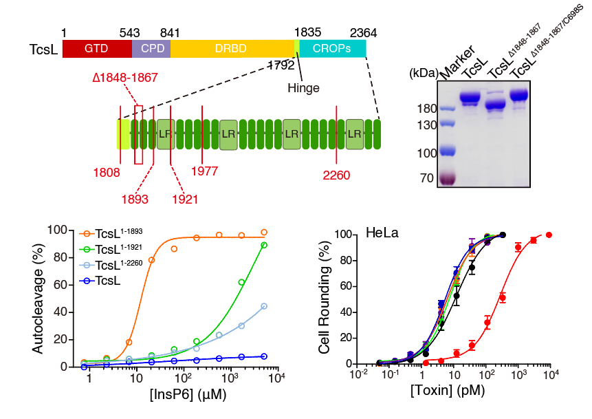 為了探究組合重復(fù)寡肽結(jié)構(gòu)域的功能,研究團(tuán)隊首先在枯草芽孢桿菌系統(tǒng)中表達(dá)了全長和組合重復(fù)寡肽缺失的TcsL蛋白。期間團(tuán)隊成員發(fā)現(xiàn)了一個有趣的現(xiàn)象:組合重復(fù)寡肽缺失的TcsL在蛋白純化過程中會自發(fā)進(jìn)行切割。通過質(zhì)譜分析和突變實驗證實切割位點位于543位的亮氨酸和544位的甘氨酸,這是TcsL中的半胱氨酸蛋白酶的自剪切位點。在全長蛋白中,需要較高濃度的六磷酸肌醇(InsP6)才能激活半胱氨酸蛋白酶的自切割活性,這說明缺失組合重復(fù)寡肽結(jié)構(gòu)會造成TcsL中的半胱氨酸蛋白酶活性失控變得過度活躍(圖2)。
